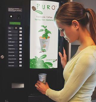 Les cafés Fairtrade sont proposés dans les distributeurs automatiques sous forme de grains, de café moulu et de café instantané. Toutes les versions sont disponibles en décaféiné. On peut également obtenir du thé Fairtrade: du thé noir et huit variétés de thé aux fruits. Et pour ceux qui préfèrent une bonne tasse de chocolat chaud, il y a aussi le mélange cacao Fairtrade composé de cacao et de sucre d'origines contrôlées.